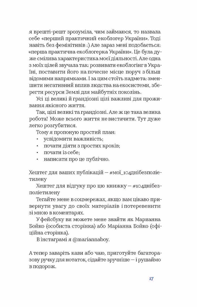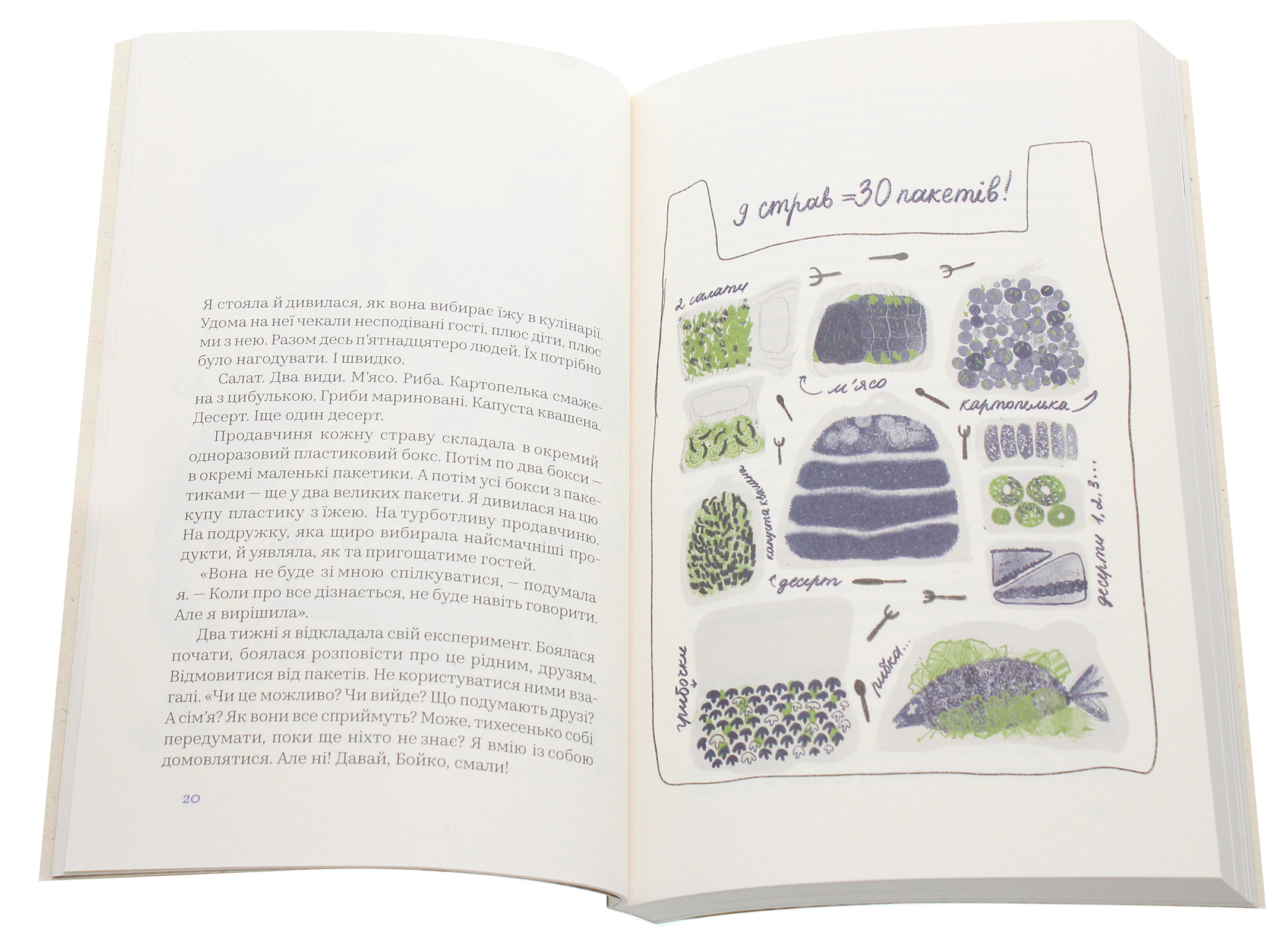 Маріанна Бойко прийняла цей виклик, провівши 104 дні без звичних пластикових речей. Як піти за покупками без жодного пакета? Як бути із шампунями та косметикою? І що робити, якщо турботлива продавчиня на ринку наполегливо пакує вам городину в пакет, здивовано промовляючи: «Доцю, та це ж безкоштовно»? Авторка провела свій експеримент в українських реаліях і охоче ділиться лайфхаками, як не тільки відмовитися від використання поліетилену, а й стати екоблогером і допомагати іншим усвідомити важливість зменшення сміття на планеті.