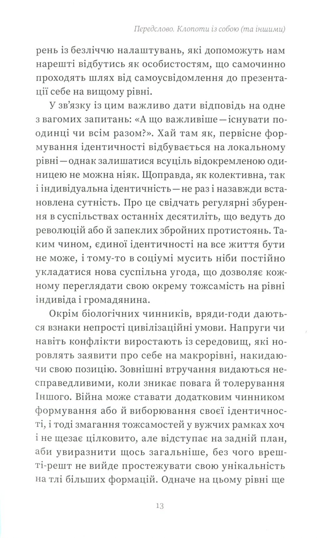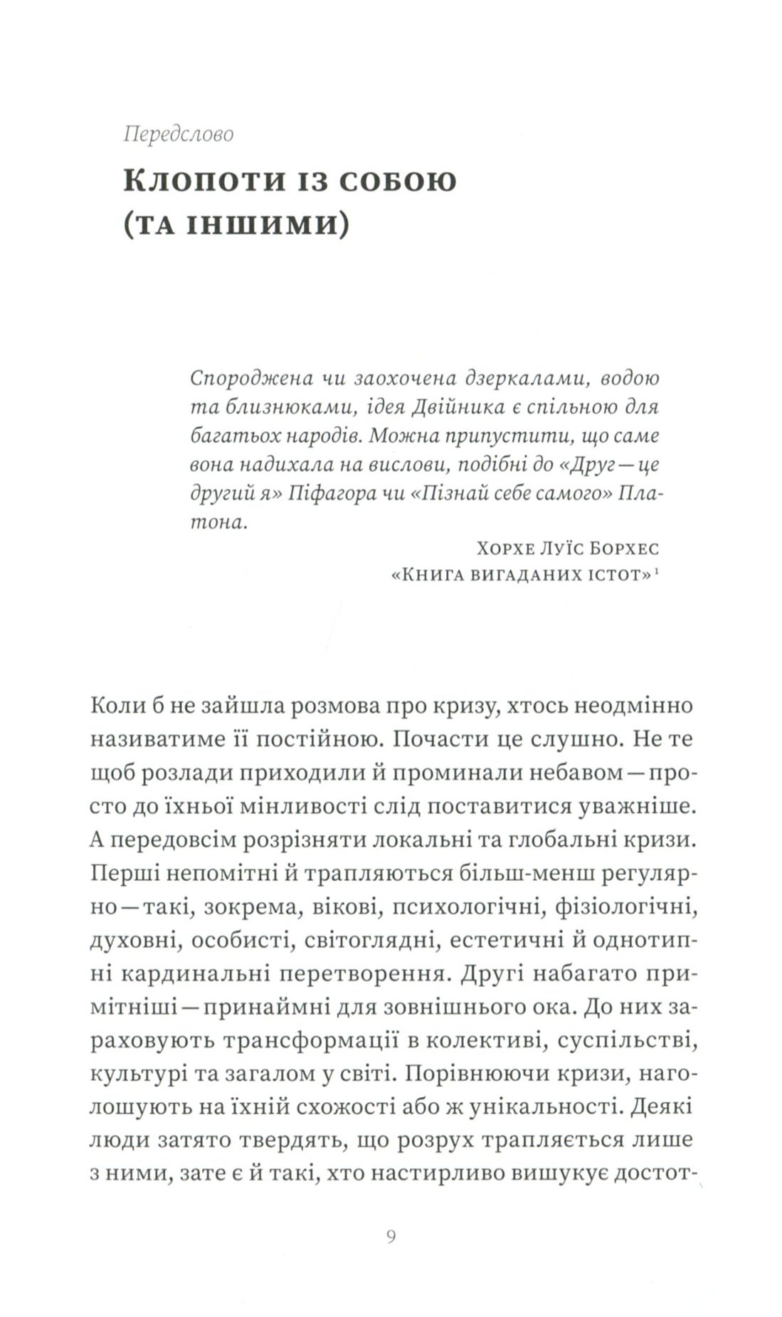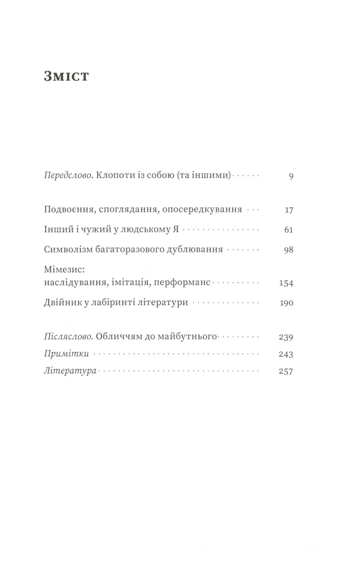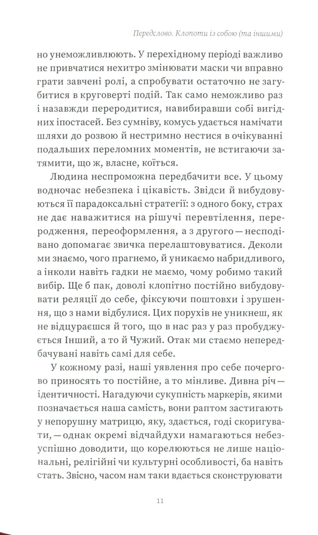 Людина — істота мінлива. Вона безупинно перероджується, опиняється в нових умовах, постійно змушена звикати до них і освоюється. Когось думки про колишні чи майбутні зміни не надто турбують, а хтось, навпаки, прагне їх навмисно, кидається у вир можливого, хоча часом це доволі болісний процес. При цьому кожній особистості властиво «розмножуватися» на силу-силенну власних двійників (не обов’язково тотожних між собою). Чому ми не завжди вчиняємо обачливо, буваємо агресивними та нетерпимими до іншості, нарочито відокремлюємо себе від усього чужого й намагаємося окреслювати свої горизонти? Чому воліємо змінюватися, хоча вважаємо себе доконечно сформованими створіннями, чому відкриті до новацій, але часом уперті й не годні поступитися ні на йоту нікому і ні в чому, легко зачудовуємося тим, чого не вміємо, але не завжди визнаємо здобутків ближніх, наслідуємо стільки, хоч відбавляй, але наполягаємо на власній правоті, захищаємо скривджених, та не хочемо дати ради собі? В оцих багатозначних подвійностях ми й намагаємося знаходити себе.