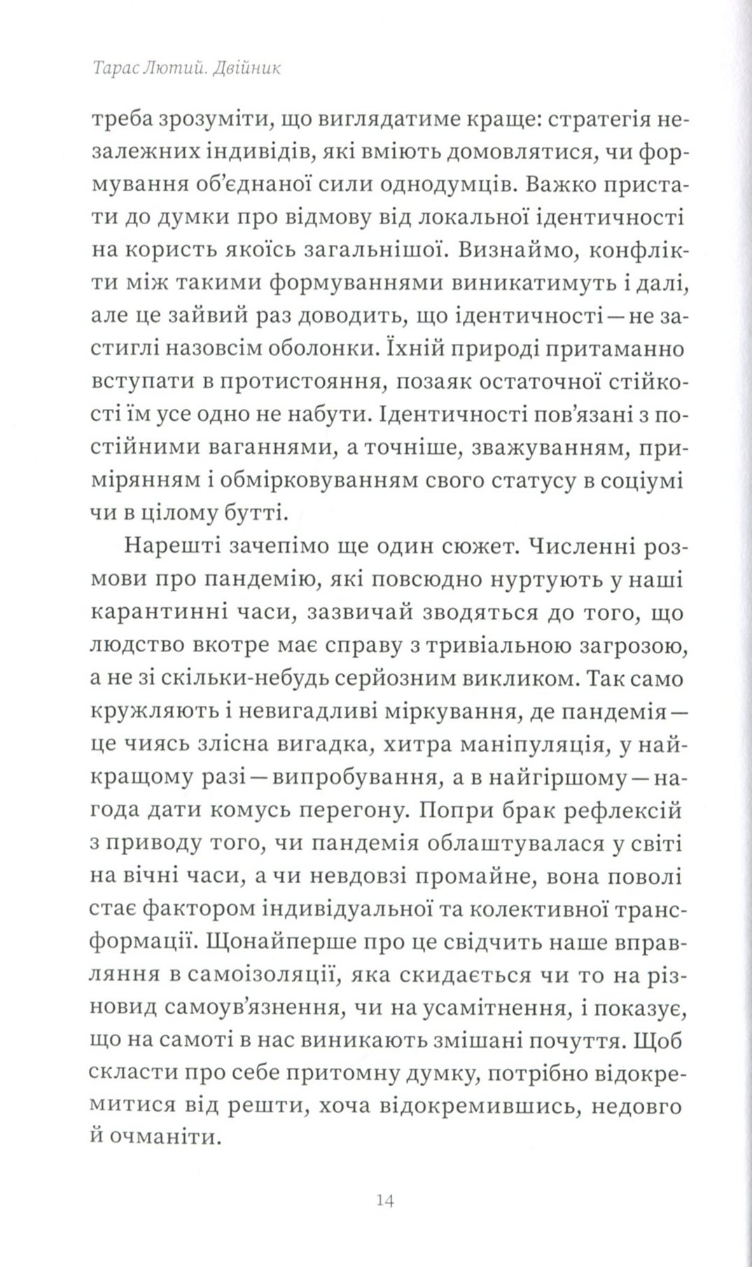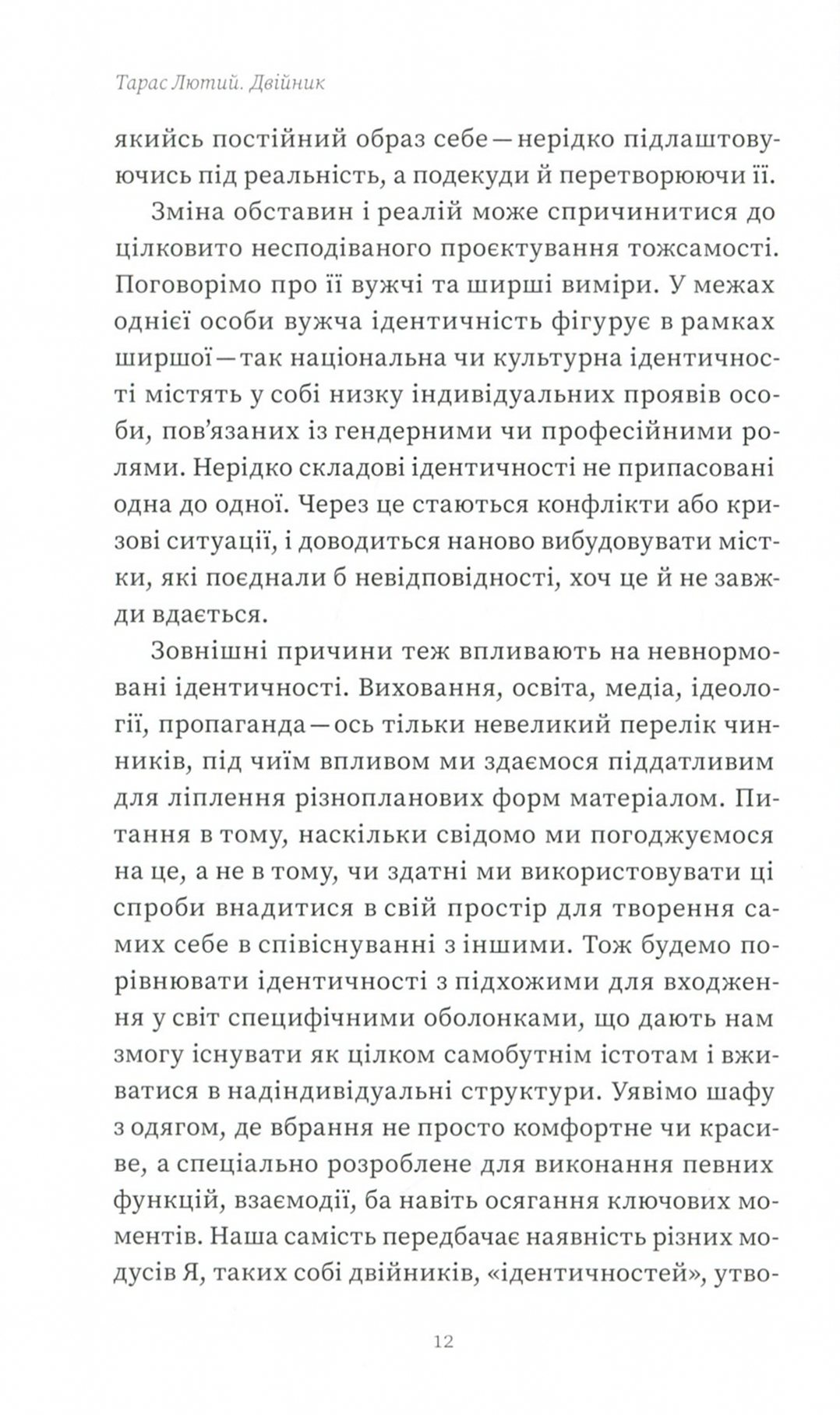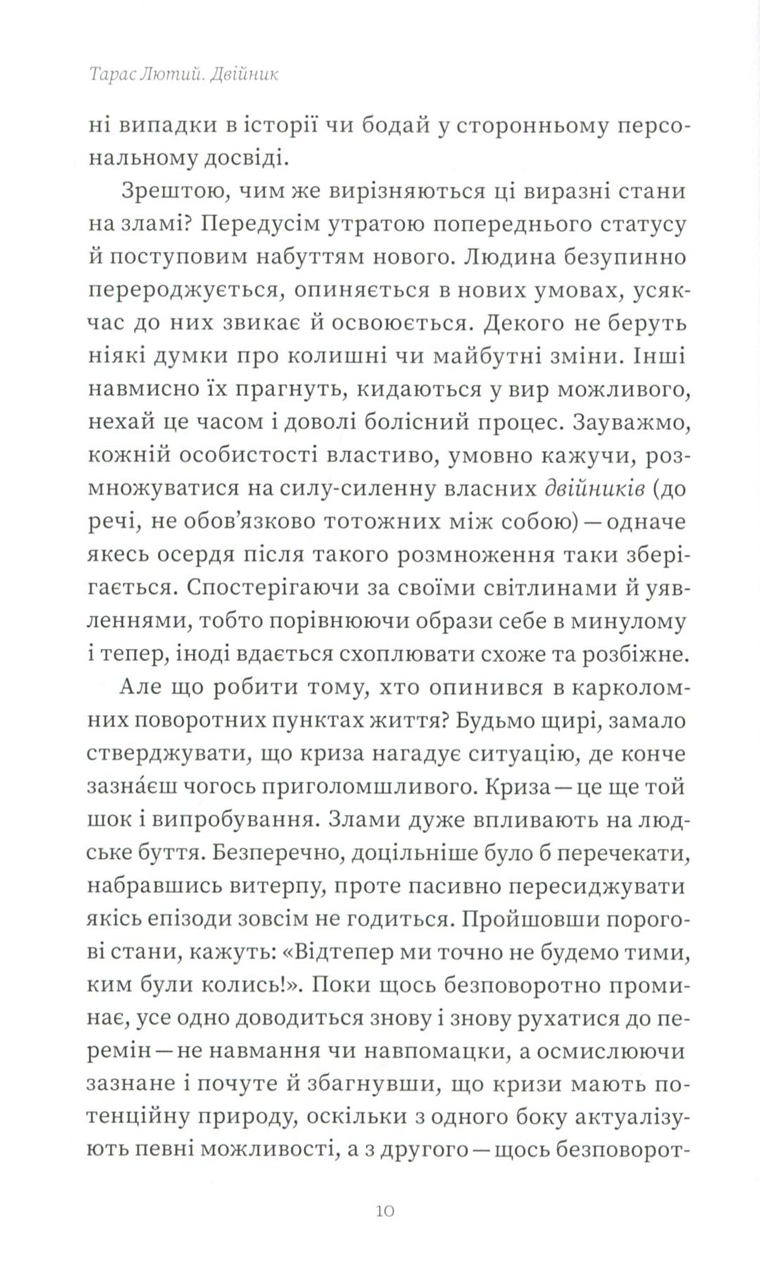Про природу людської подвійності, дублювання й множинності й розмірковує Тарас Лютий у своїй книжці. Автор зацікавився цією темою понад двадцять років тому, а останнім часом нотував свої міркування в окремих есеях. Нарешті всі дослідження й розвідки з теми двійництва зібрані в одній книжці.