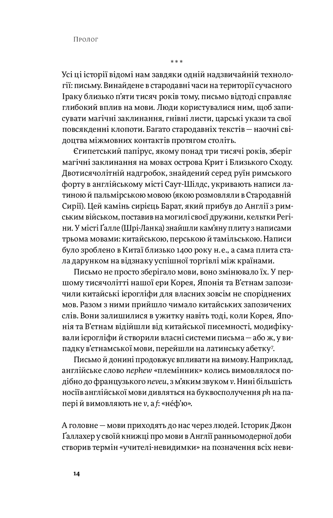 Це книжка про мови й про людей, які в них кохаються. Про дивні, чудові способи використання мов людьми ще із часів найперших записів на глиняних табличках. Про мовні ниточки, які пов’язують нас усіх. Понад усе, ця книжка — суцільне задоволення.