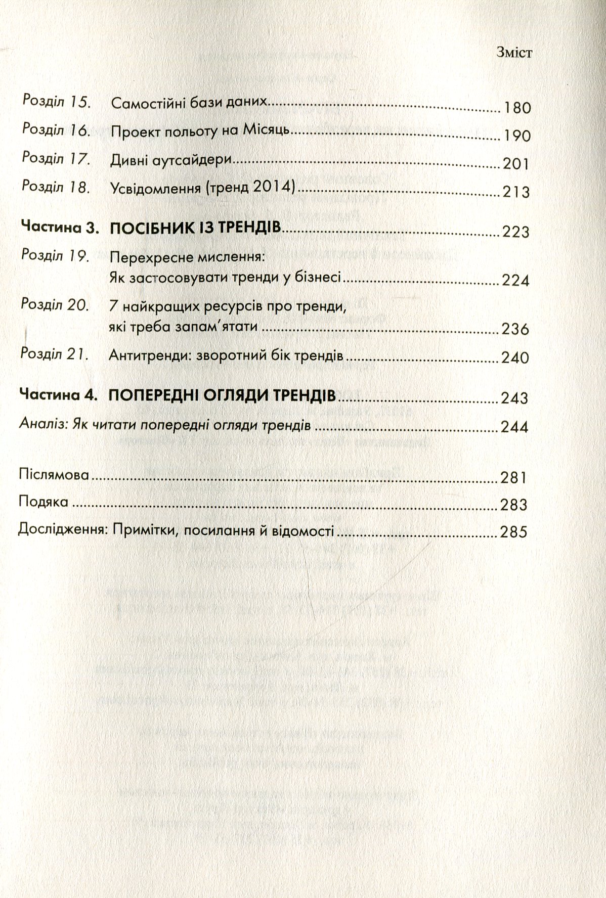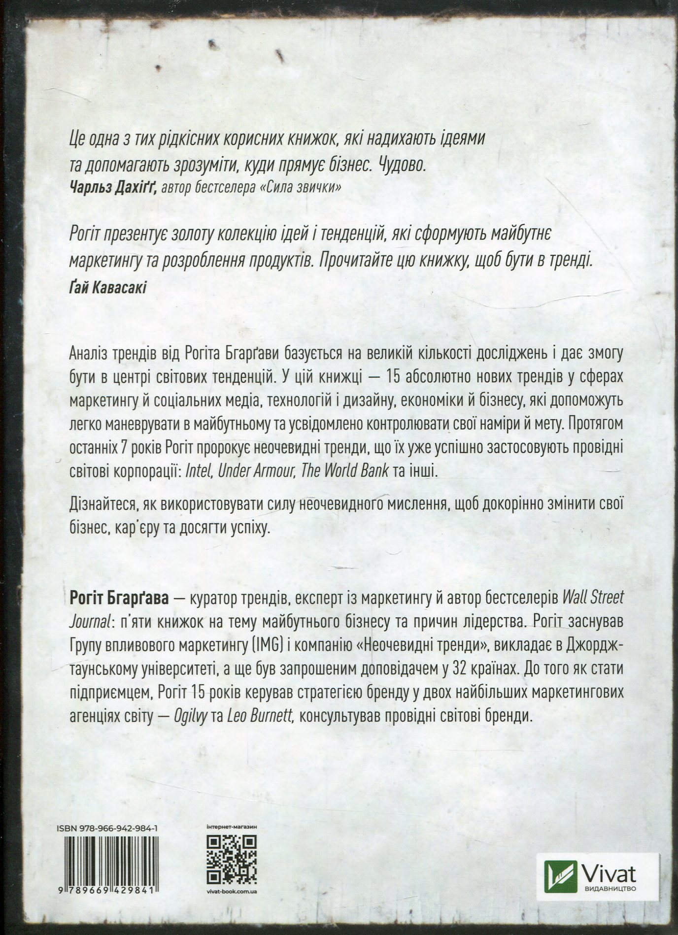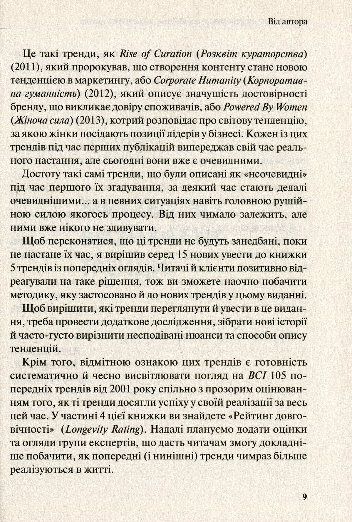 Аналіз тенденцій Рогіта Бгарґави базується на великій кількості досліджень і дає змогу бути в центрі світових трендів. У цій книжці — 15 абсолютно нових тенденцій у сферах маркетингу й соціальних медіа, технологій і дизайну, економіки й бізнесу, які допоможуть легко маневрувати в майбутньому та усвідомлено контролювати свої наміри й мету. Протягом останніх 7 років Рогіт пророкує неочевидні тренди, що їх вже успішно застосовують провідні світові корпорації, такі як Intel, Under Armour, The World Bank тощо.