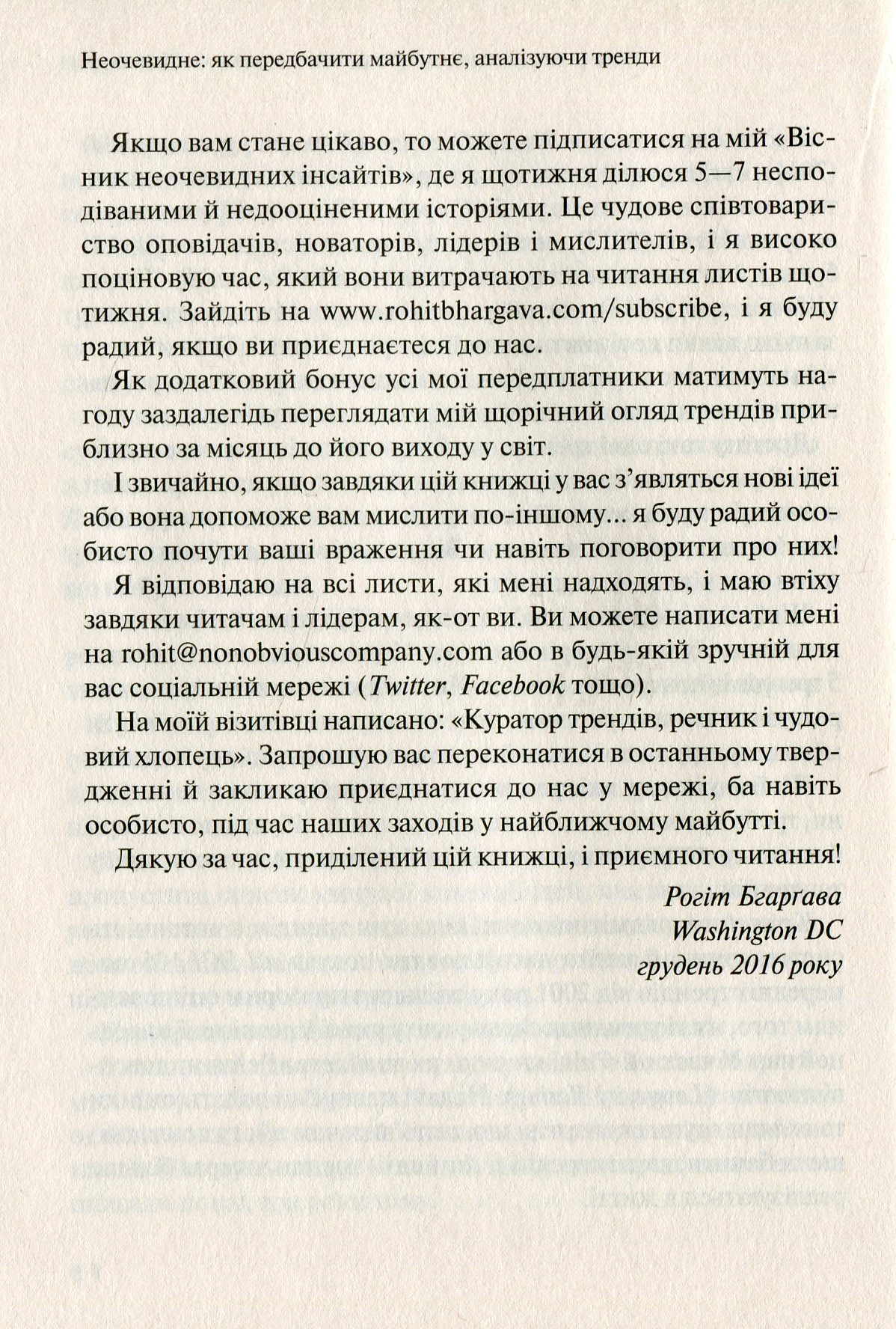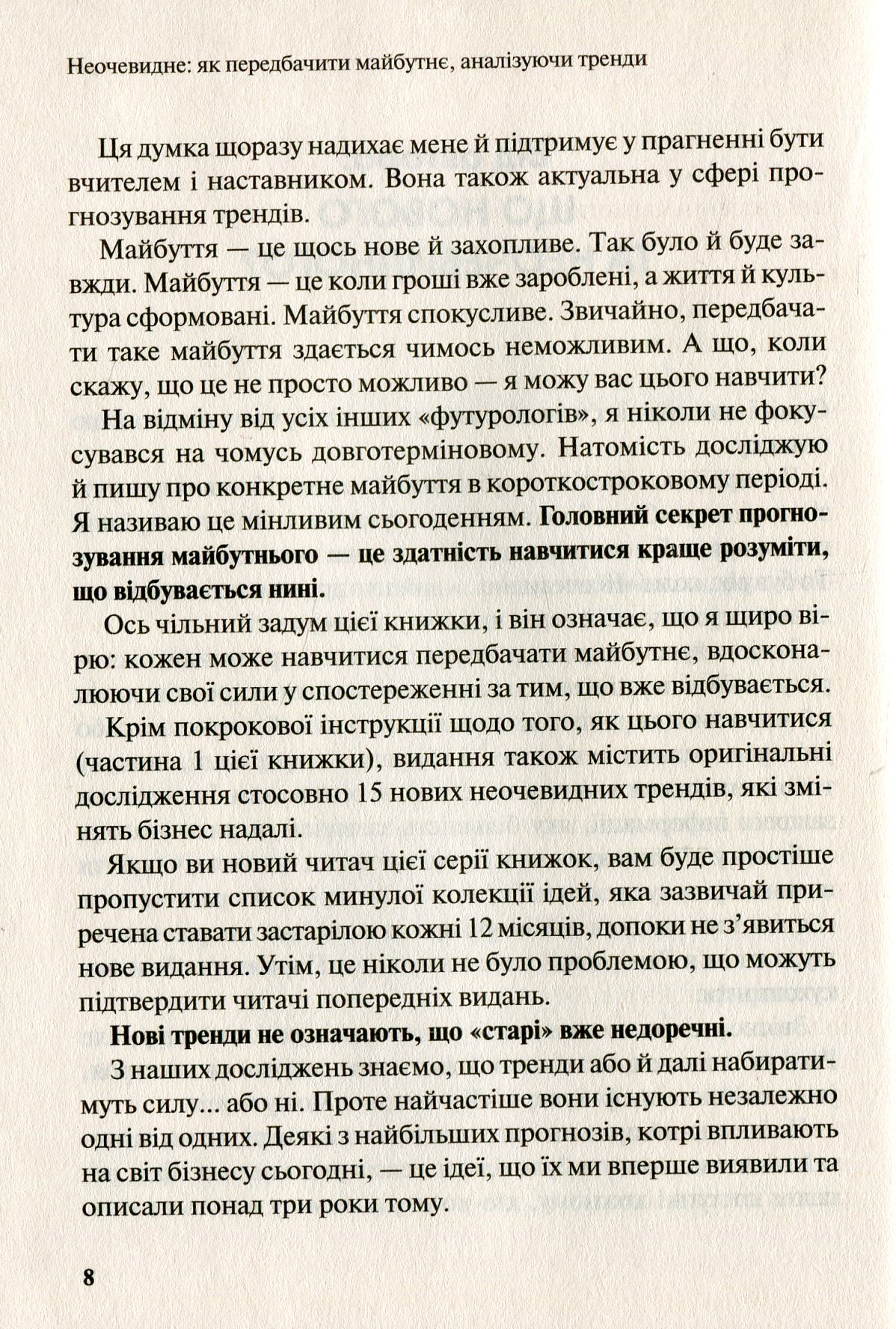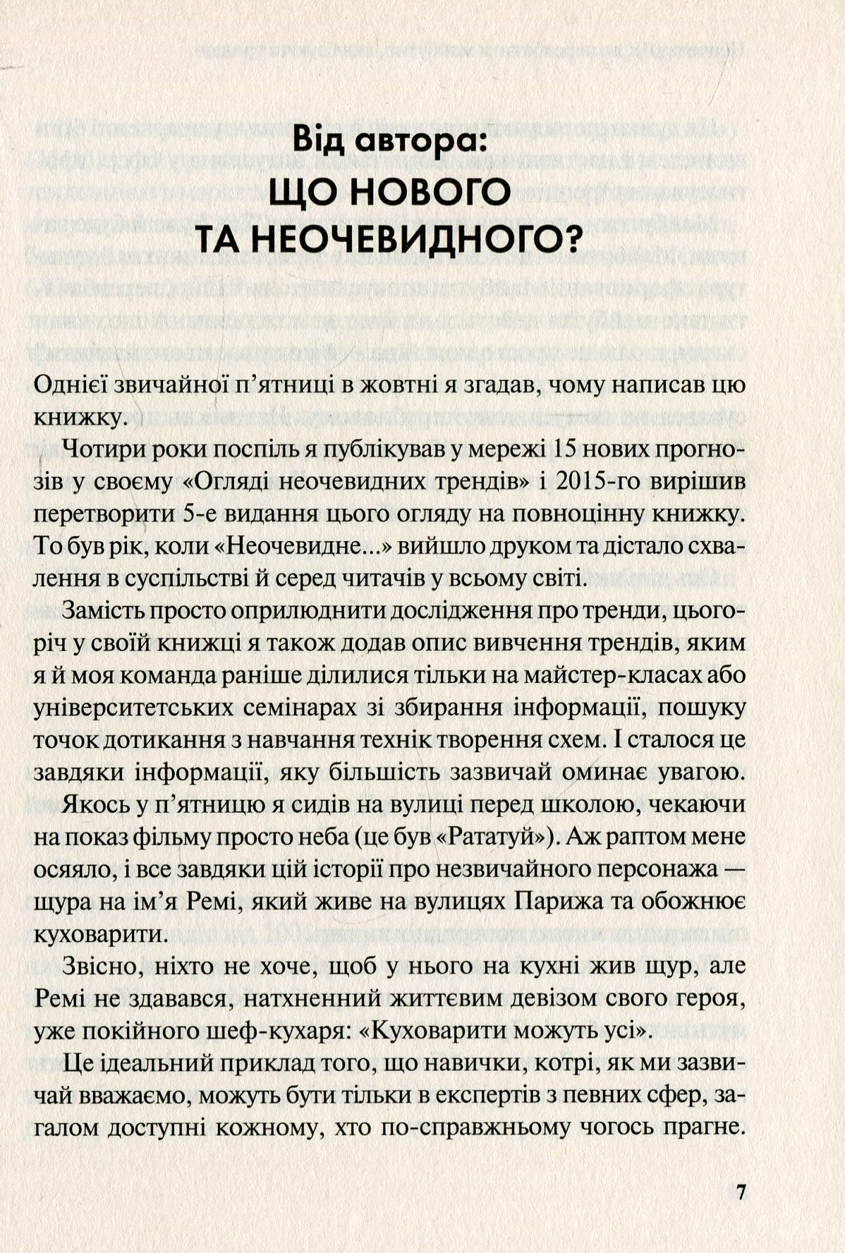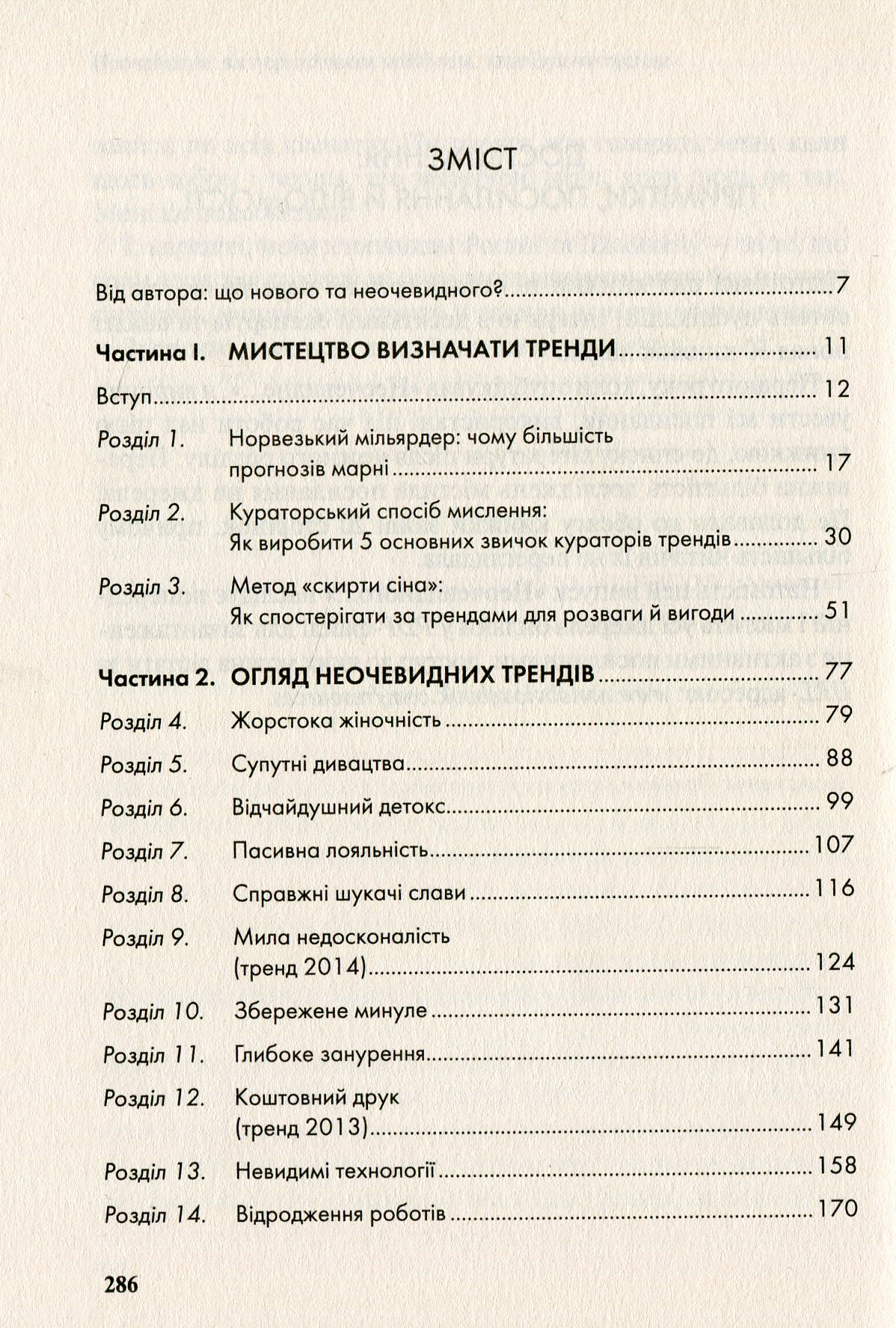 Аналіз тенденцій Рогіта Бгарґави базується на великій кількості досліджень і дає змогу бути в центрі світових трендів. У цій книжці — 15 абсолютно нових тенденцій у сферах маркетингу й соціальних медіа, технологій і дизайну, економіки й бізнесу, які допоможуть легко маневрувати в майбутньому та усвідомлено контролювати свої наміри й мету. Протягом останніх 7 років Рогіт пророкує неочевидні тренди, що їх вже успішно застосовують провідні світові корпорації, такі як Intel, Under Armour, The World Bank тощо.