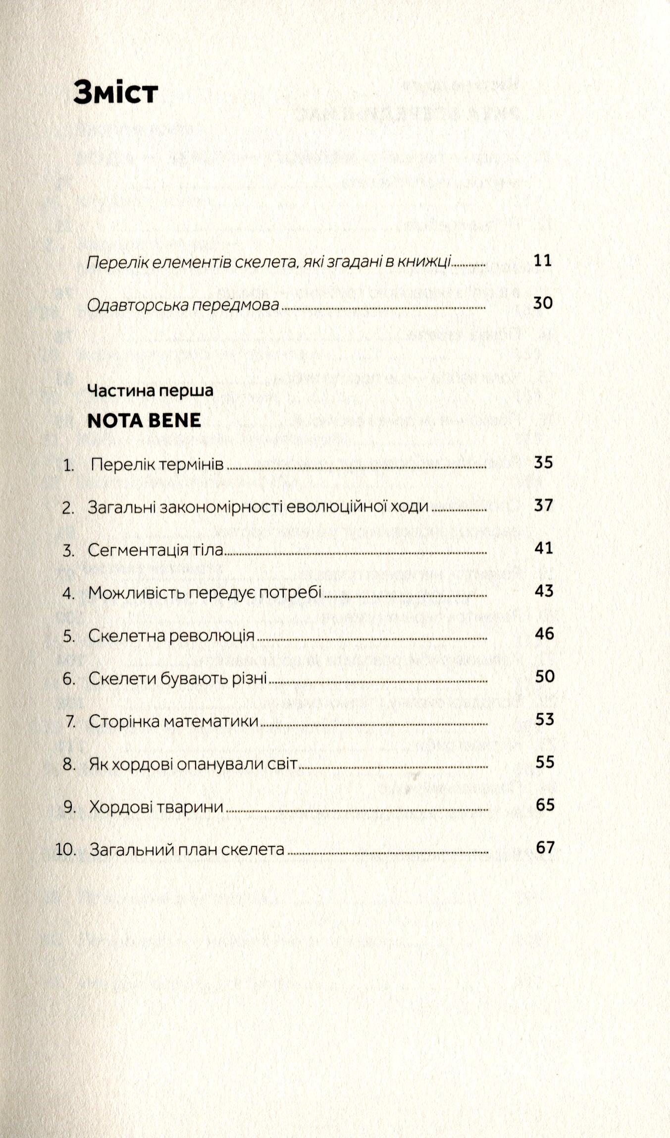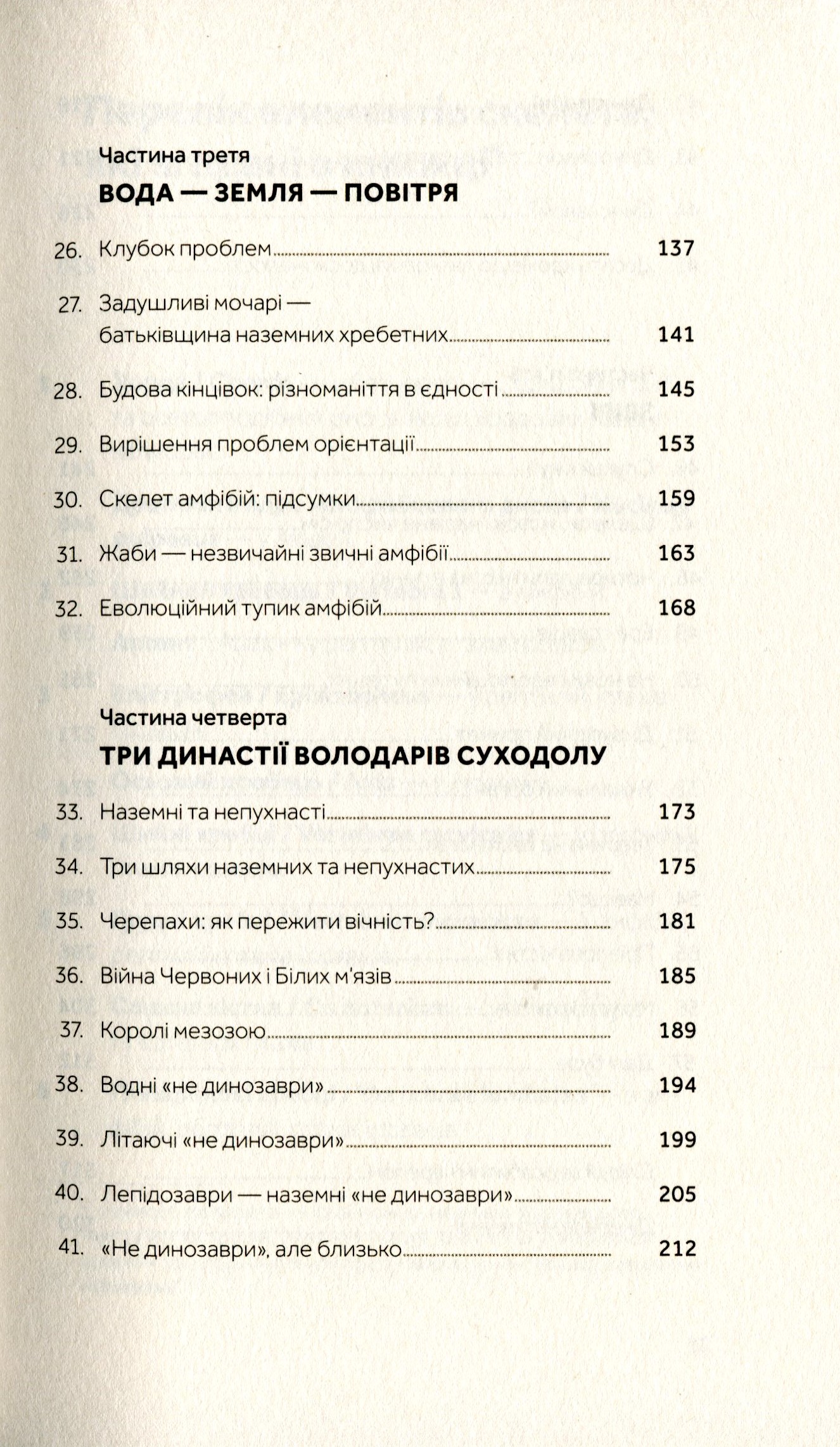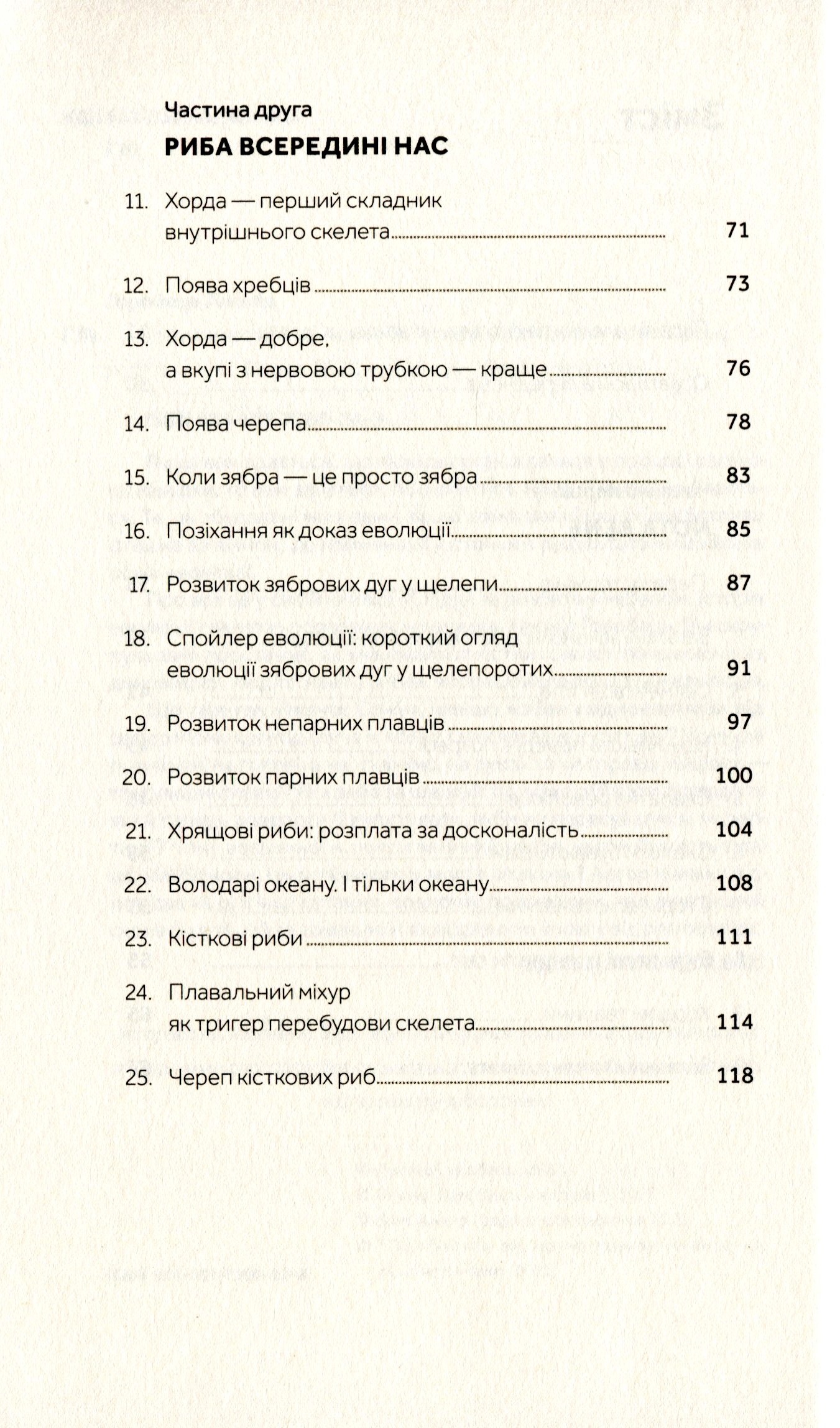 Що таке ген «їжачок сонік», навіщо жабам «відмовлятися» від ребер і чому крокодиляче м’ясо на смак нагадує курятину? Чому очі розміщені на голові, а не, скажімо, на руках та чи справді кінцівки — то колишні плавці? Яка риба за швидкістю може обігнати гепарда та який палець довелося б ампутувати, якби ми пересувалися, як рептилії? Чому восьминоги, попри великий мозок, часом бувають тупіші, ніж бджоли, і що спільного в акул з літаками? Автор книжки відповідає на ці й інші питання, водночас пояснюючи, чим внутрішній скелет крутіший за зовнішній і як відрізнити колегу від рептилоїда.