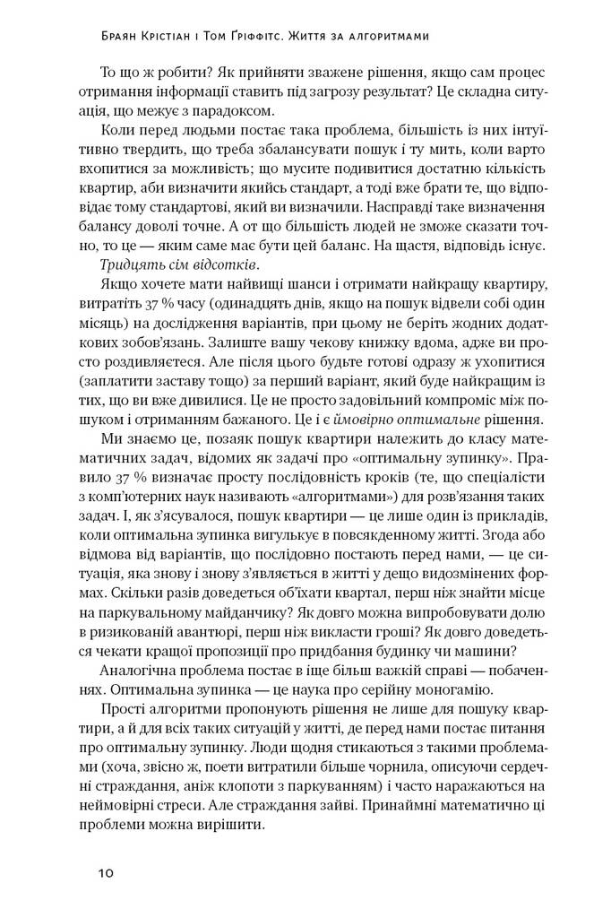 У цій книжці Браян Крістіан і Том Ґріффітс розповідають про теорію, за основу якої взято дослідження комп’ютерних алгоритмів, що можуть застосовуватися для розв’язання побутових проблем. Жити за алгоритмами не означає існувати за одноманітною схемою. Це означає шукати найкращий варіант вирішення проблем, витрачаючи оптимальну кількість зусиль і часу.